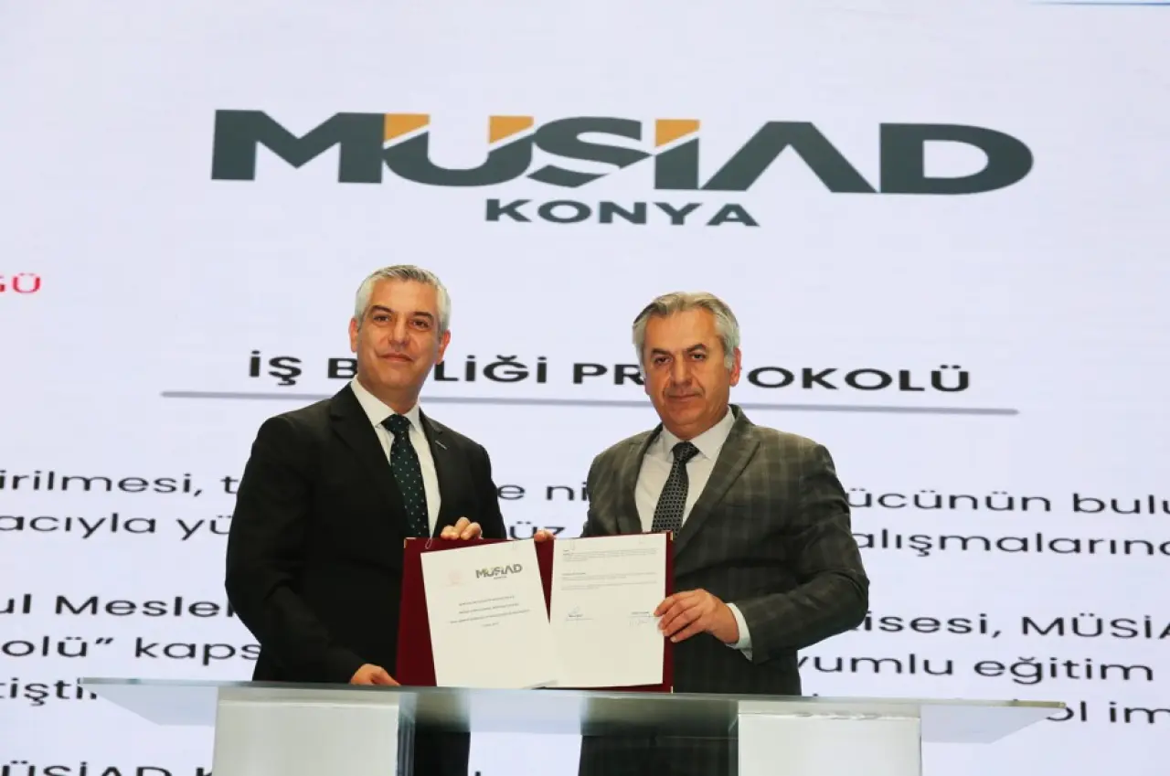 Konya İl Millî Eğitim Müdürlüğü ile MÜSİAD Konya Şubesi, eğitim ile sanayi arasındaki bağları güçlendirmek ve mesleki eğitimi desteklemek amacıyla “Okul–Sanayi İş Birliği Protokolü”nü imzaladı.