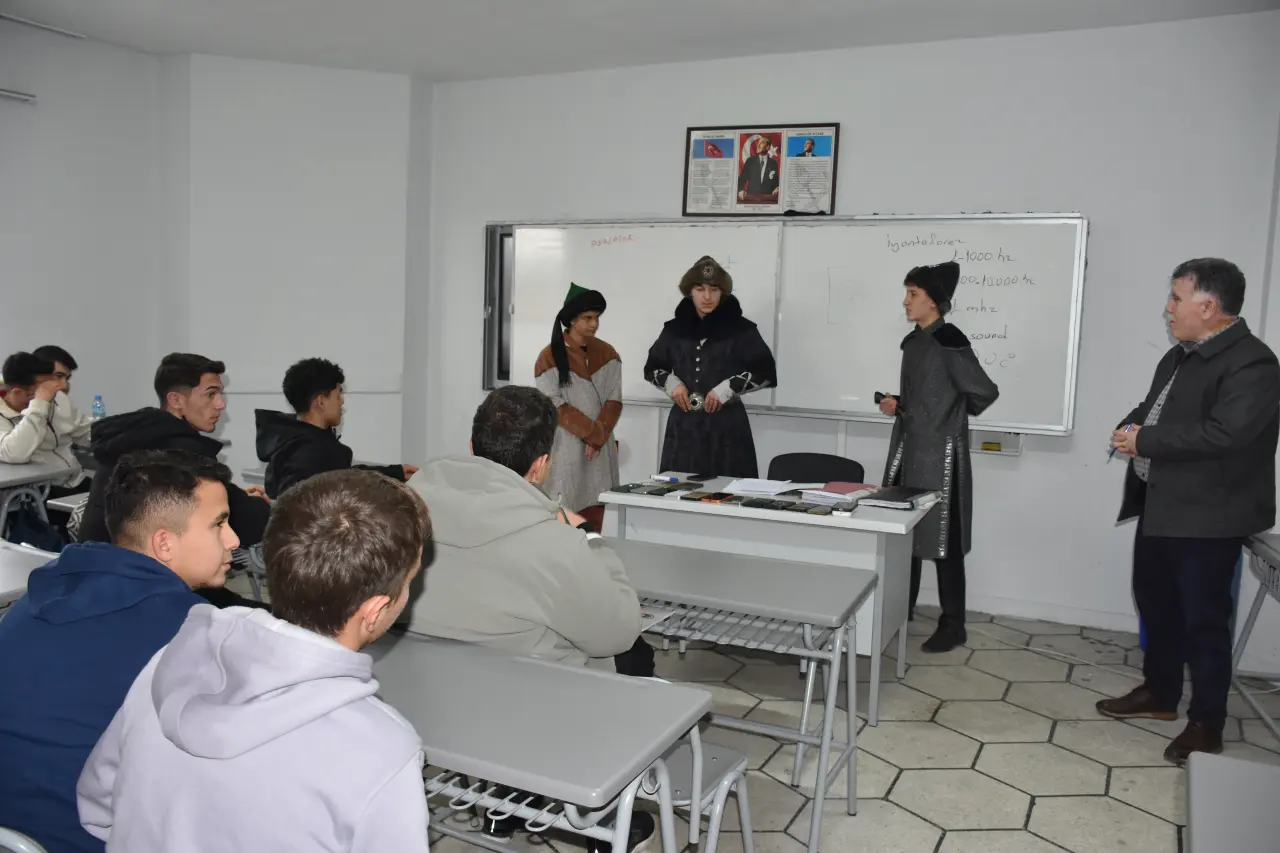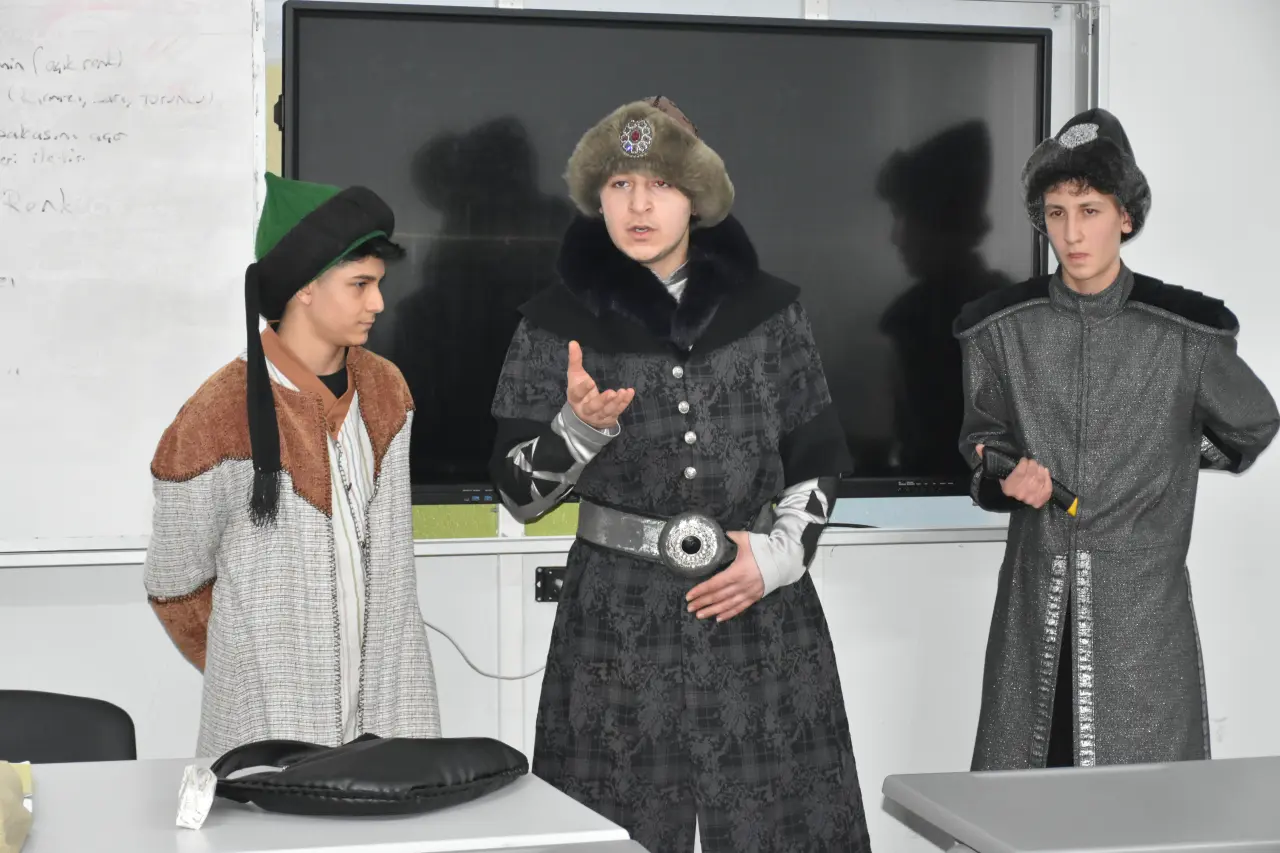Sultan Alaaddin Keykubat, Ahi Evran ve Selçuklu askeri kostümleri giyen öğrenciler, 4-5 dakikalık oyunla Ahiliğin incelikleri hakkında bilgi veriyor.