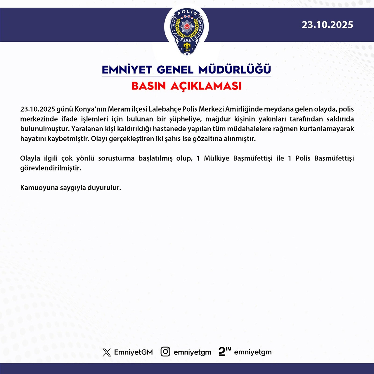 Emniyet Genel Müdürüğü tarafından yapılan açıklamada, "23.10.2025 günü Konya'nın Meram ilçesi Lalebahçe Polis Merkezi Amirliğinde meydana gelen olayda, polis merkezinde ifade işlemleri için bulunan bir şüpheliye, mağdur kişinin yakınları tarafından saldırıda bulunulmuştur. Yaralanan kişi kaldırıldığı hastanede yapılan tüm müdahalelere rağmen kurtarılamayarak hayatını kaybetmiştir. Olayı gerçekleştiren iki şahıs ise gözaltına alınmıştır. Olayla ilgili çok yönlü soruşturma başlatılmış olup, 1 Mülkiye Başmüfettişi ile 1 Polis Başmüfettişi görevlendirilmiştir. Kamuoyuna saygıyla duyurulur" denildi.